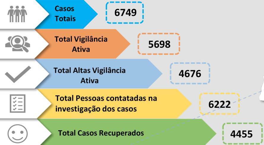 O total de vigilâncias ativas de acordo com os dados da Saúde Pública indicam que foram colocadas em vigilância 5698 pessoas, das quais já tiveram alta 4676 pessoas. De referir que estas pessoas têm obrigação de estar confinados em casa até terem alta da Autoridade de Saúde Pública.