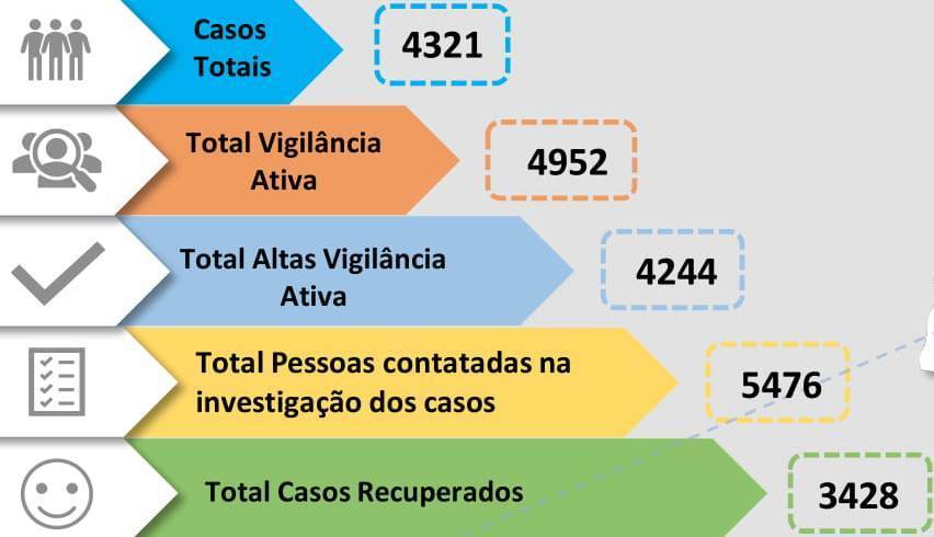 Já no que diz respeito às vigilâncias o relatório dá conta de um total de 4952 pessoas colocadas em confinamento pela autoridade de saúde da qual já tiveram alta 4244. Nesta segunda-feira são 773 pessoas, mais 22 que ontem, a estar confinadas porque tiveram contacto direto com infetados. Estes confinamentos estão registados em Abrantes (54), Alcanena (45), Constância (9), Entroncamento (84), Ferreira do Zêzere (18), Mação (98), Ourém (151), Sardoal (10), Tomar (102), Torres Novas (185) e Vila Nova da Barquinha (12).