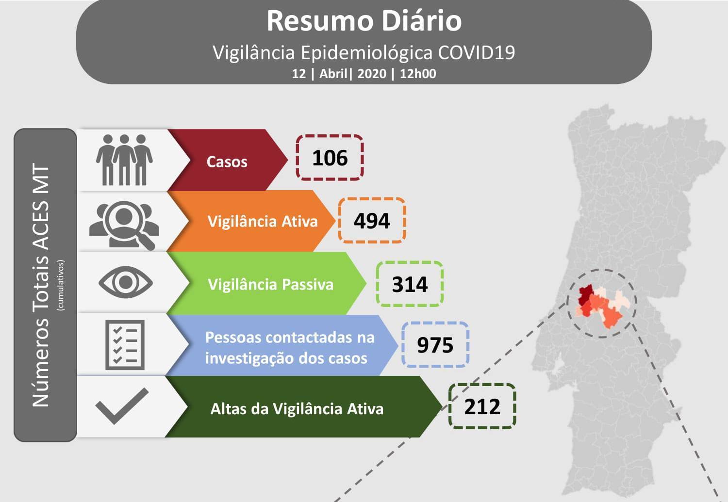 O Médio Tejo tem mais três casos de infeções com a doença COVID-19, provocada pelo novo coronavírus, passando agora a somar 106 doentes. Segundo o Boletim Epidemiológico do ACES Médio Tejo deste domingo de Páscoa há a registar um novo caso em Abrantes (que passa a ter 17 doentes) e dois em Ourém (que passa a ter 31 situações). Também é em Ourém que aumentam neste domingo as vigilâncias ativas, com mais cinco residentes naquele concelho a fazer subir o total das 489 de ontem para 494 no dia de hoje.