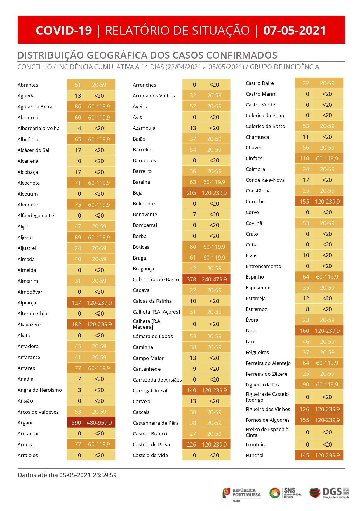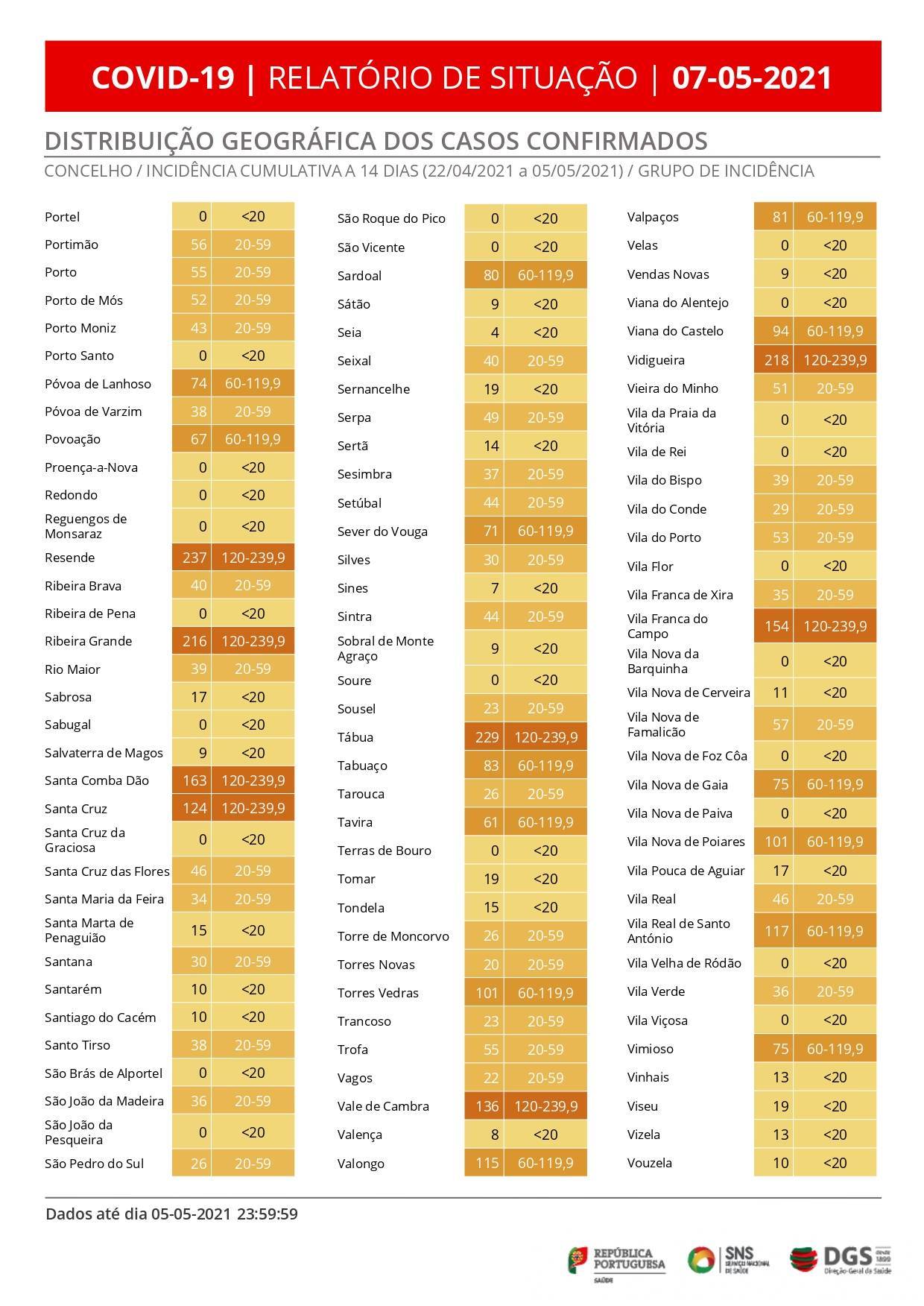 Alpiarça (127), Coruche (155) e Alpiarça (169) são os concelhos que estão no laranja (mais de 120 novos casos por 100 mil habitantes nos últimos 14 dias) portanto, sob um olhar mais atento das autoridades de saúde.