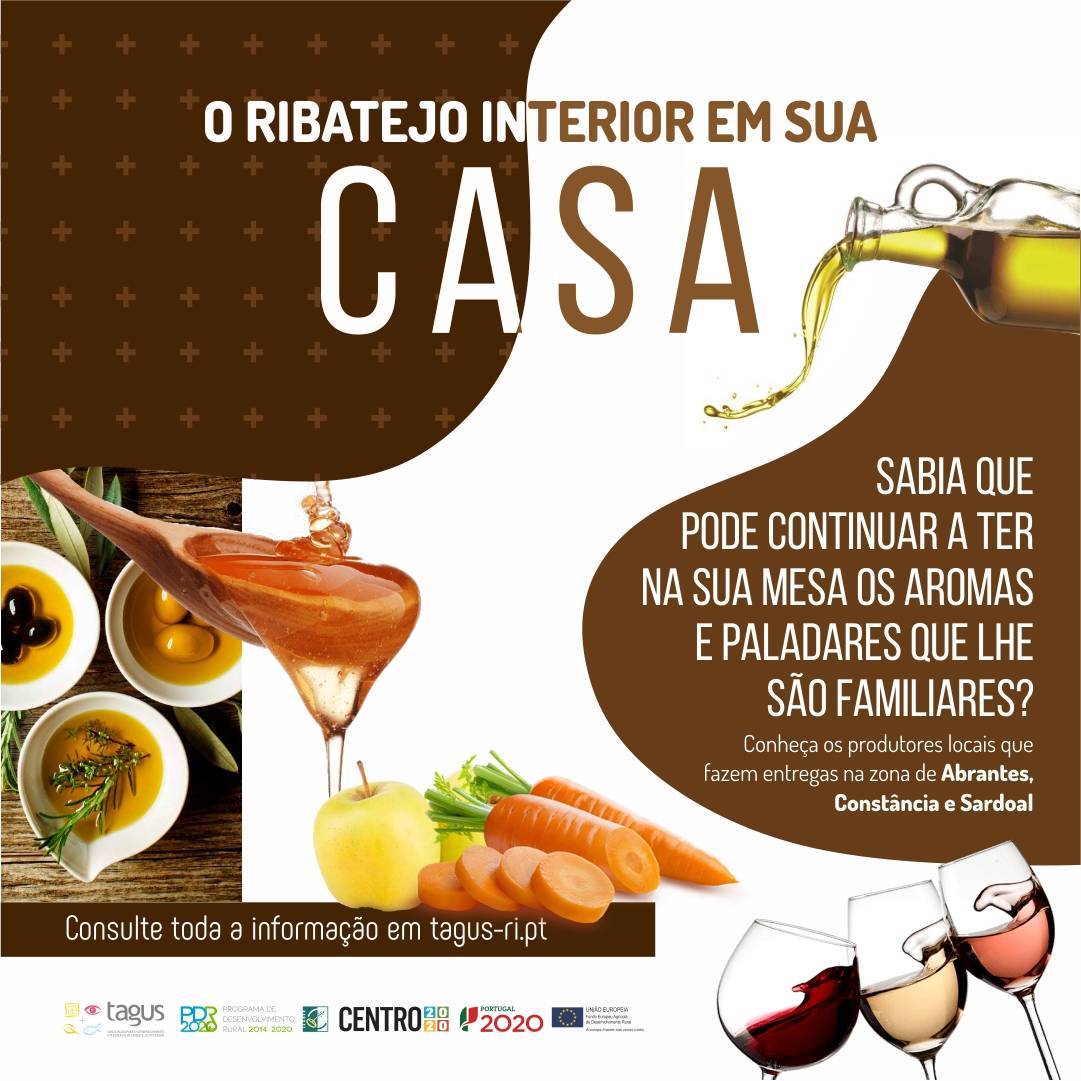 Sob o mote “O Ribatejo Interior em sua casa”, a Associação de Desenvolvimento Local já está a avançar com alguns dos produtos do Ribatejo Interior. E à medida que for recebendo informações dos produtores, que estão a entregar em casa dos consumidores, vai atualizando a informação. Se produz agroalimentares, tem a sua atividade devidamente legalizada, e está a entregar ao domicílio nos concelhos de Abrantes, Constância e Sardoal, envie um email para tagus@tagus-ri.pt com os seus dados.