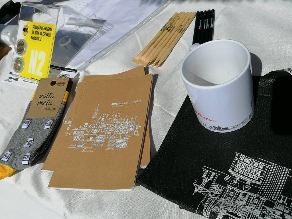 Para o aproveitamento do Portugal de Lés-a-Lés e a sua ligação à Estrada Nacional 2, este ano, a autarquia de Abrantes apresentou um conjunto de produtos de merchandising. Desde moedas, porta-chaves, caderno, canetas, canecas, peúgas, ímanes, podiam ser encontrados no ponto de turismo do Município, instalado em pleno Largo 1.º de Maio. Quadro bancas, uma com merchandising da Nacional 2, outra com produtos regionais, ainda uma com a promoção turística do concelho e uma quarta, que não podia faltar, destinada a carimbar os passaportes da Nacional 2. Muitos dos participantes, assim que faziam o checkpoint de chegada tentavam localizar o local certo para receber, no seu passaporte, o carimbo de Abrantes. Aliás, todos os participantes receberam, após a chegada, uma bolsa plástica, amarela, da Nacional 2. Uma forma de poderem guardar os passaportes para futuros passeios pela estrada que rasga Portugal.