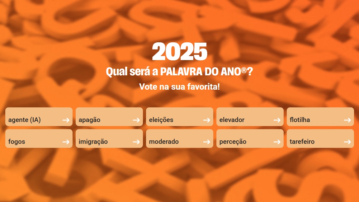 Em comunicado, a Porto Editora anunciou que as dez palavras que vão ser votadas são “agente (IA)”, “apagão”, “eleições”, “elevador”, “flotilha”, “fogos”, “imigração”, “moderado”, “perceção” e “tarefeiro”.