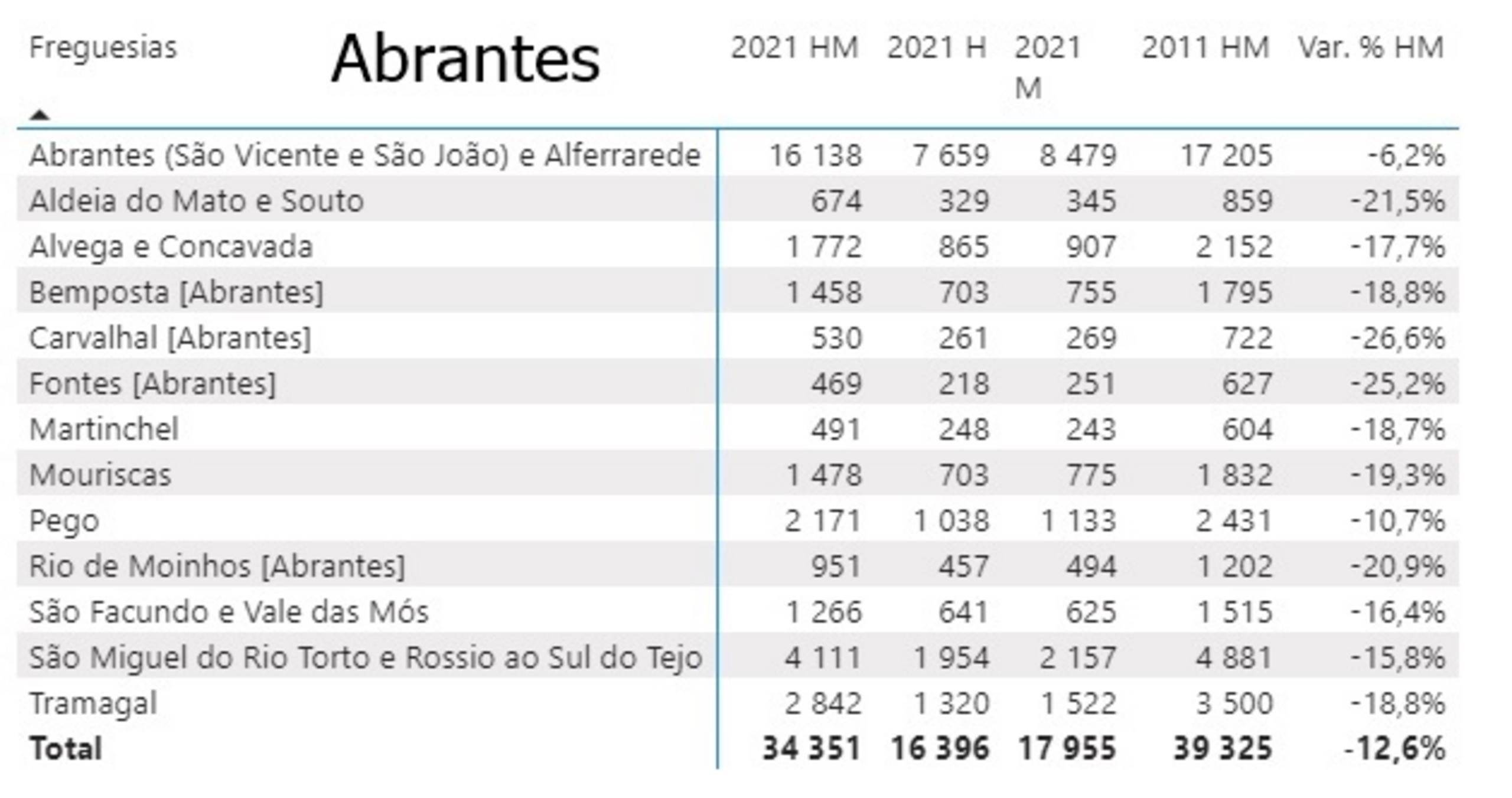 Com uma variação da população residente superior a -5% entre 2011 e 2021 estão ainda Golegã (-8,7%), Torres Novas (-7,0%), Constância (-6,3%) e Cartaxo (-5,1%).