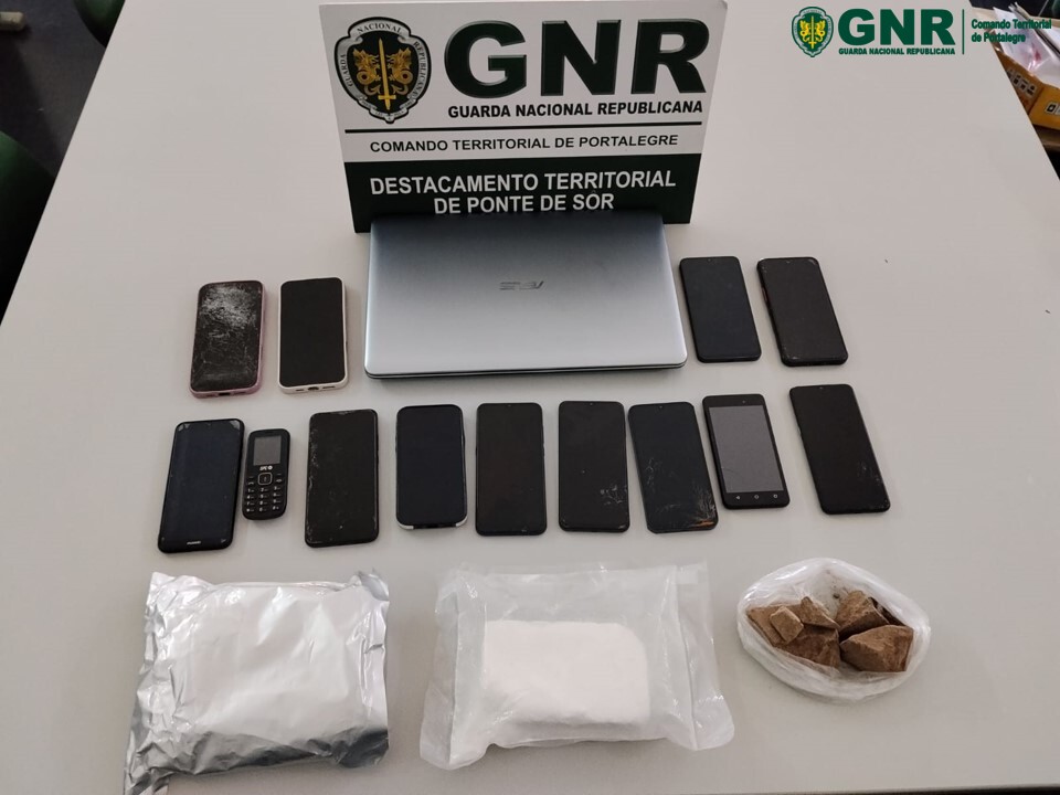 Na ação da GNR foram apreendidas perto de seis mil doses de cocaína, mais de 1.200 doses de heroína, três doses de haxixe, além de 13 telemóveis e um computador portátil.