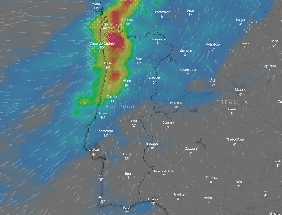 Segundo o IPMA, a chuva forte irá ocorrer entre a madrugada e o princípio da tarde de sábado e entre a madrugada e tarde de domingo, “podendo os valores acumulados variar entre 100 e 180 mm [milímetros] nas regiões montanhosas e entre 80 e 100 mm nas regiões não montanhosas”.