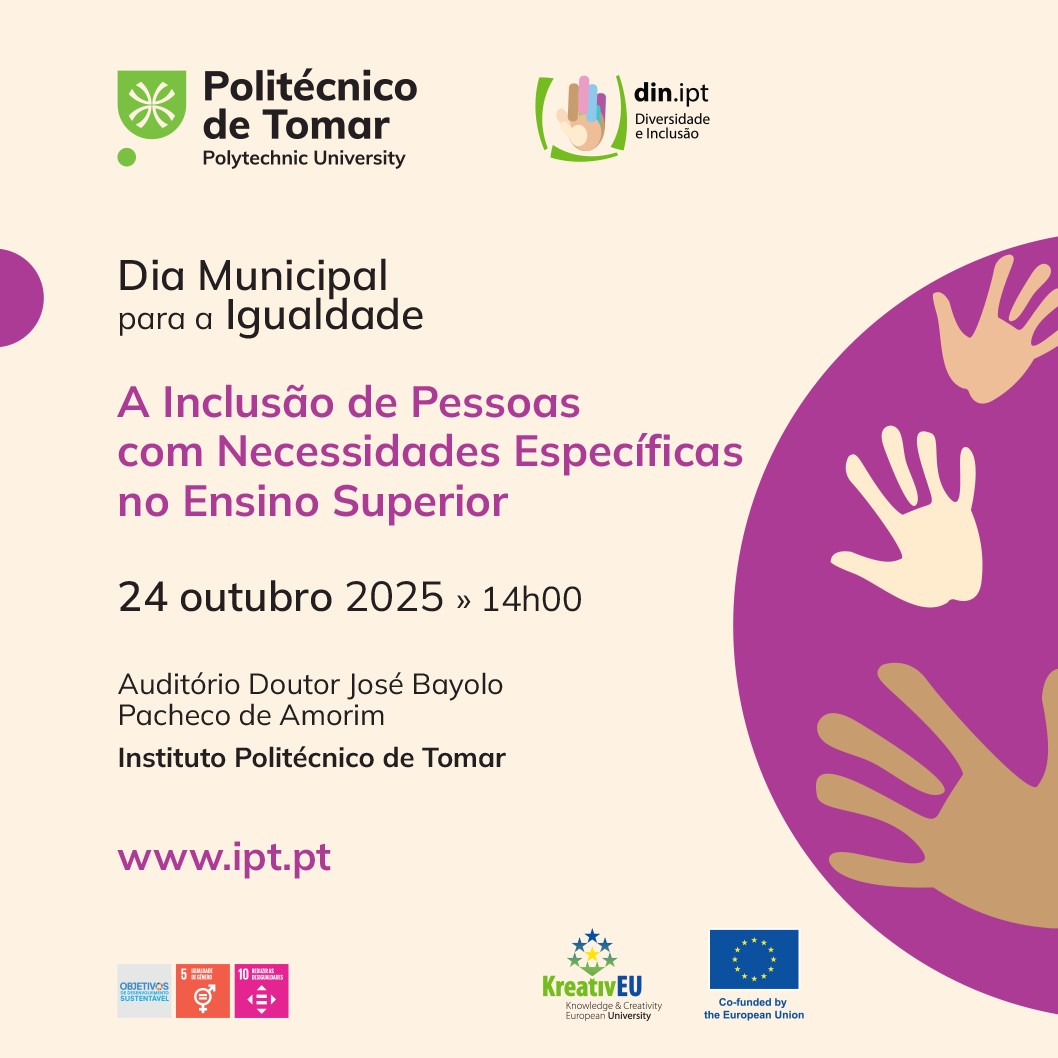 Para celebrar o Dia Municipal para a Igualdade, no próximo dia 24 de outubro, pelas 14h00, no auditório José Bayolo Pacheco de Amorim do Politécnico de Tomar, realiza-se o Seminário “A inclusão de pessoas com necessidades educativas específicas no ensino superior”.