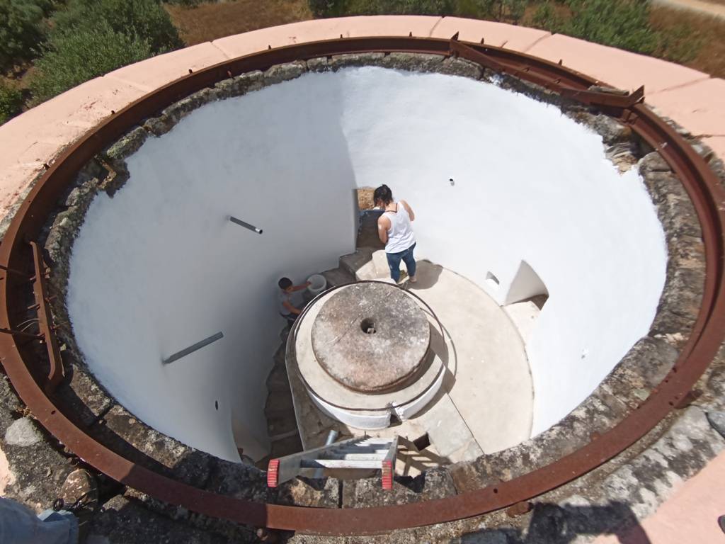 O moinho, como os outros, estava já em pedra. A ACROM deu andamento a esta ideia de o recuperar e começou as intervenções na estrutura de construção. Toda a parede, circular, foi rebocada. No sábado foram feitos trabalhos de limpeza do interior e a pintura de toda a estrutura.