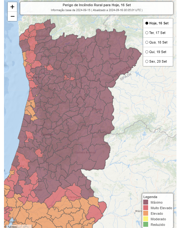 Em perigo máximo de incêndio estão mais de 100 concelhos dos distritos de Faro, Portalegre, Castelo Branco, Santarém, Leiria, Coimbra, Guarda, Aveiro, Viseu, Porto, Bragança, Vila Real, Viana do Castelo e Braga.