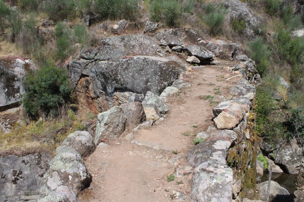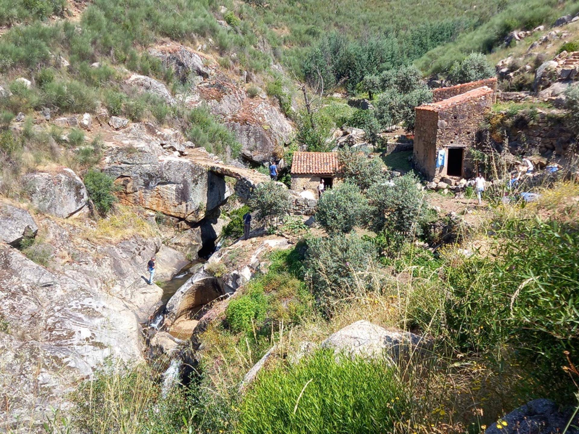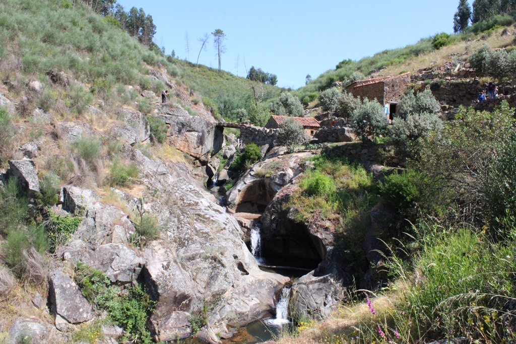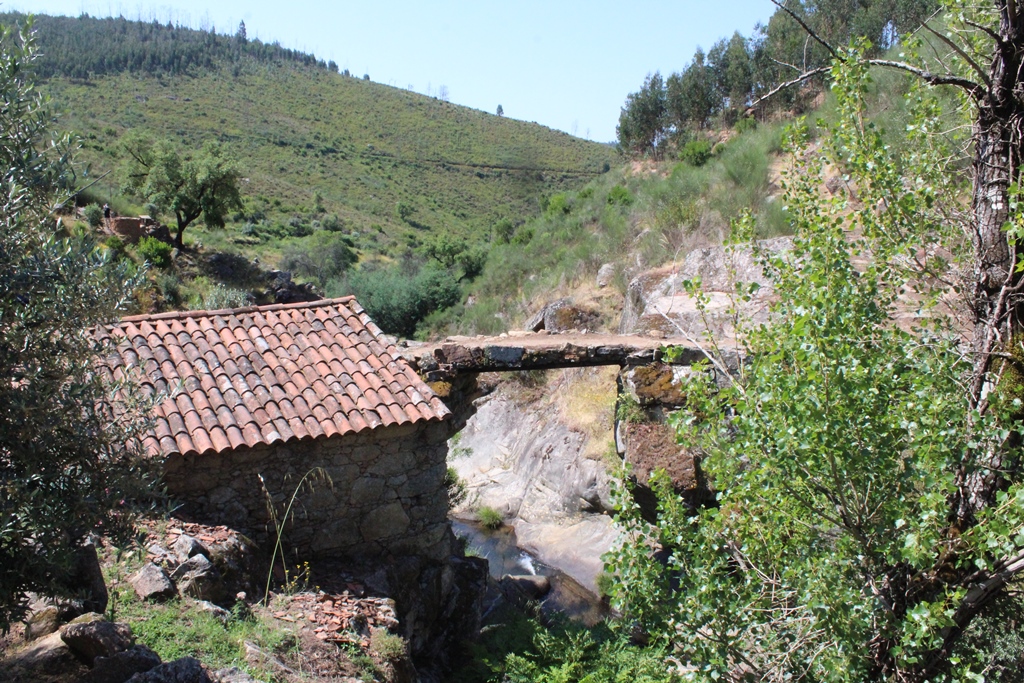 E no Poço das Talhas, da Queixoperra, ao lado da azenha há uma ponte sobre a ribeira. Não tem um vão muito comprido, mas tem alguma altura. E quando falamos numa travessia natural da ribeira, Rui Silva coça a rir-se e diz que não, não é natural. “Foi no tempo do meu avô que foi construída. Uns homens que andavam aqui a construir a linha de Caminhos de Ferro da Beira Baixa vinham aqui beber uns copitos [de vinho]. E entre os copitos lá fizeram a ponte que é alta, mas mantém-se cá”.