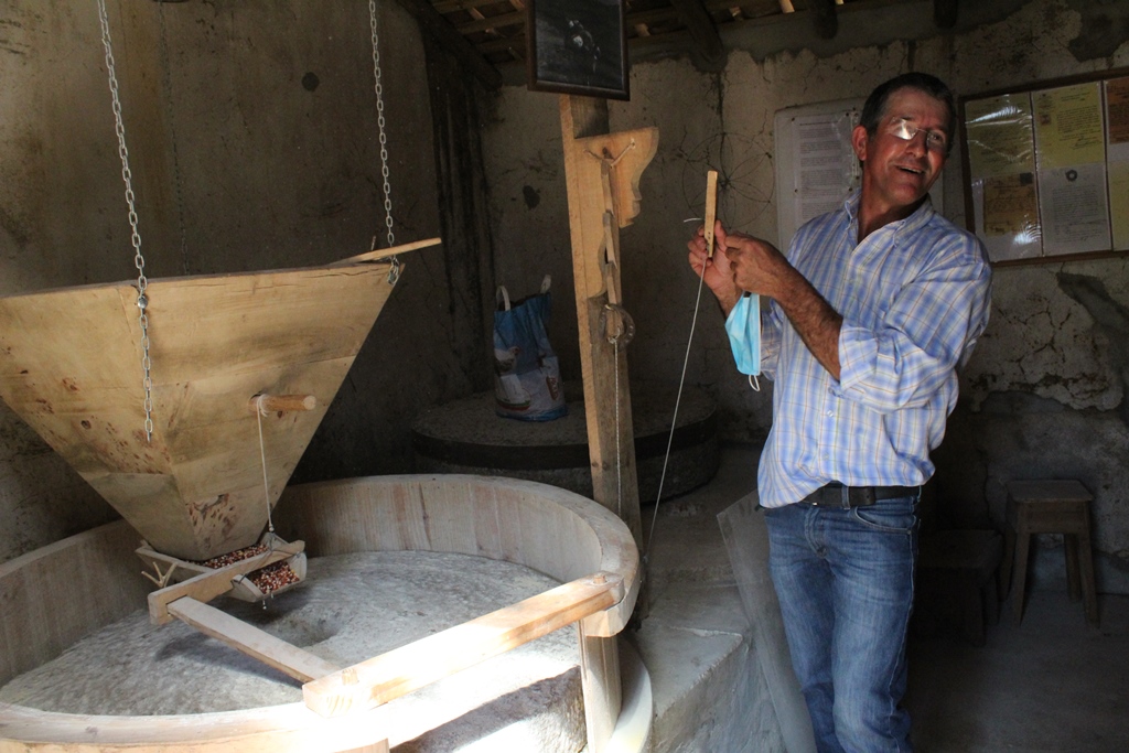 E, pouco a pouco, lá foi abrindo os matos para colocar a descoberto a azenha e o palheiro de apoio. Recuperou os telhados e a levada que levava a água a cair na roda que iria colocar a “pedra a rodar”. Depois foi estudar a preceito o mecanismo para poder voltar a moer. Os cabos que operam o desvio da água para a pedra ou para a ribeira. O mecanismo que faz parar a moagem quando o silo de madeira fica sem milho “para não desgastar as pedras”. É com orgulho que o Rui mostra como funcionam estas mecânicas ancestrais e que agora funcionam quando é preciso, desde que não falte a água na ribeira.