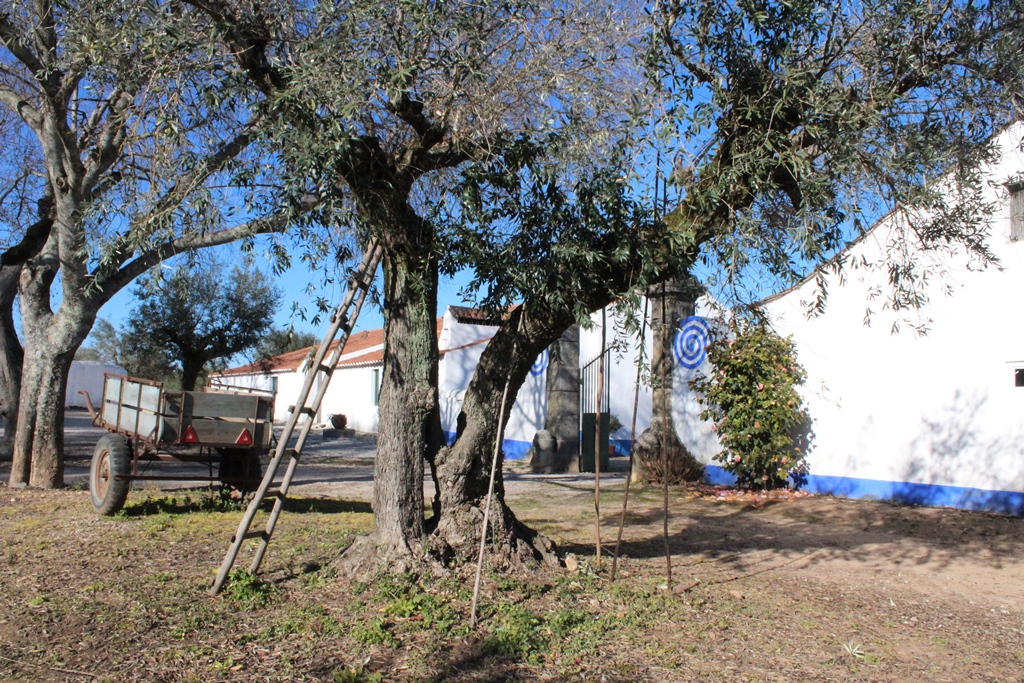 Ainda antes da entrada, há uma pequena mostra dos utensílios que eram necessários há cinco ou seis décadas para a apanha da azeitona. As varas, os panos, as escadas e a carroça. Os ranchos de homens e mulheres, muitos que vinham das beiras, juntavam-se e calcorreavam o terreno, oliveira a oliveira para apanhar todo o fruto. Hoje, explica Rui Pereira Coutinho, é tudo mecanizado.