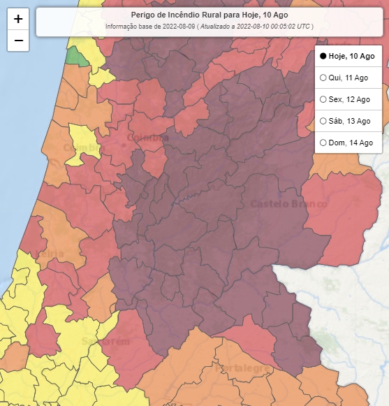De acordo com a informação disponível no 'site' do IPMA, as concelhos que estão sob risco máximo localizam-se nos distritos de Bragança, Vila Real, Braga, Porto, Coimbra, Guarda, Viseu, Castelo Branco, Santarém e Portalegre.