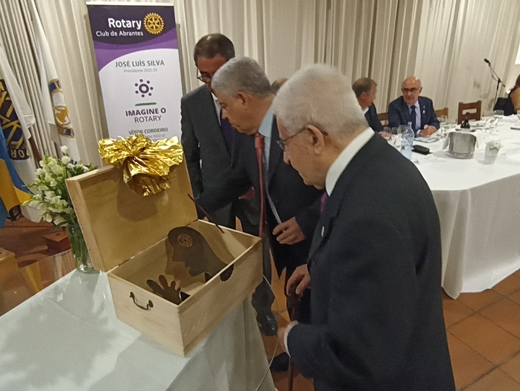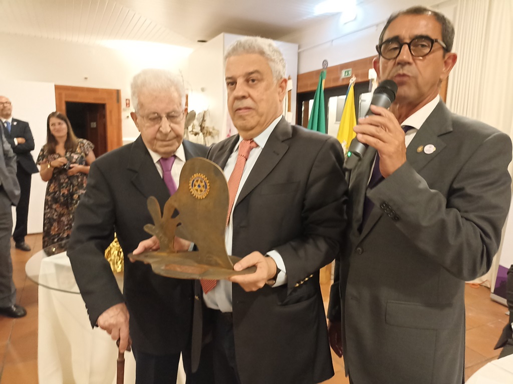 João Tavares recebeu uma lembrança do clube que ajuntou a fundar e que é uma miniatura da escultura que o Rotary ofereceu à comunidade e instalou junto ao Hospital em Abrantes.