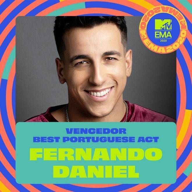 A 27.ª edição dos MTV EMAs 2020 aconteceu ontem, com transmissão em 180 países e Fernando Daniel sagrou-se, pelo segundo ano consecutivo, vencedor na categoria Best Portuguese Act, onde concorria com Diogo Piçarra, Bárbara Bandeira, Bispo e Dino D’ Santiago.