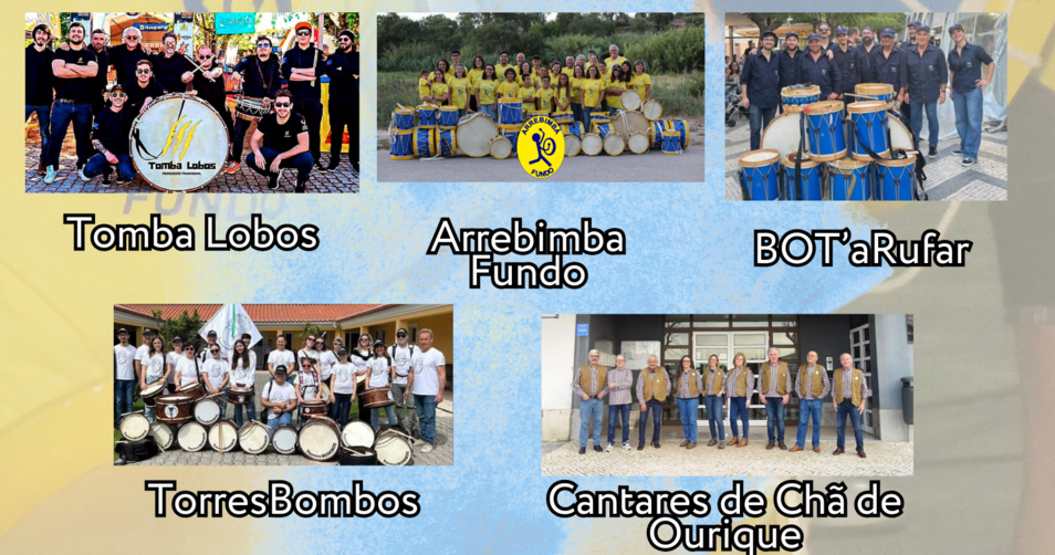 A edição deste ano vai contar com quatro grupos de bombos e um grupo de música tradicional. Atuarão os Arrebimbá Fundo, “o grupo da nossa casa”, e também os TorresBombos (Torres Vedras), BOT'aRufar (Torres Novas), Tomba Lobos (Redondo) e o Grupo de Cantares de Vila Chã de Ourique (Cartaxo).