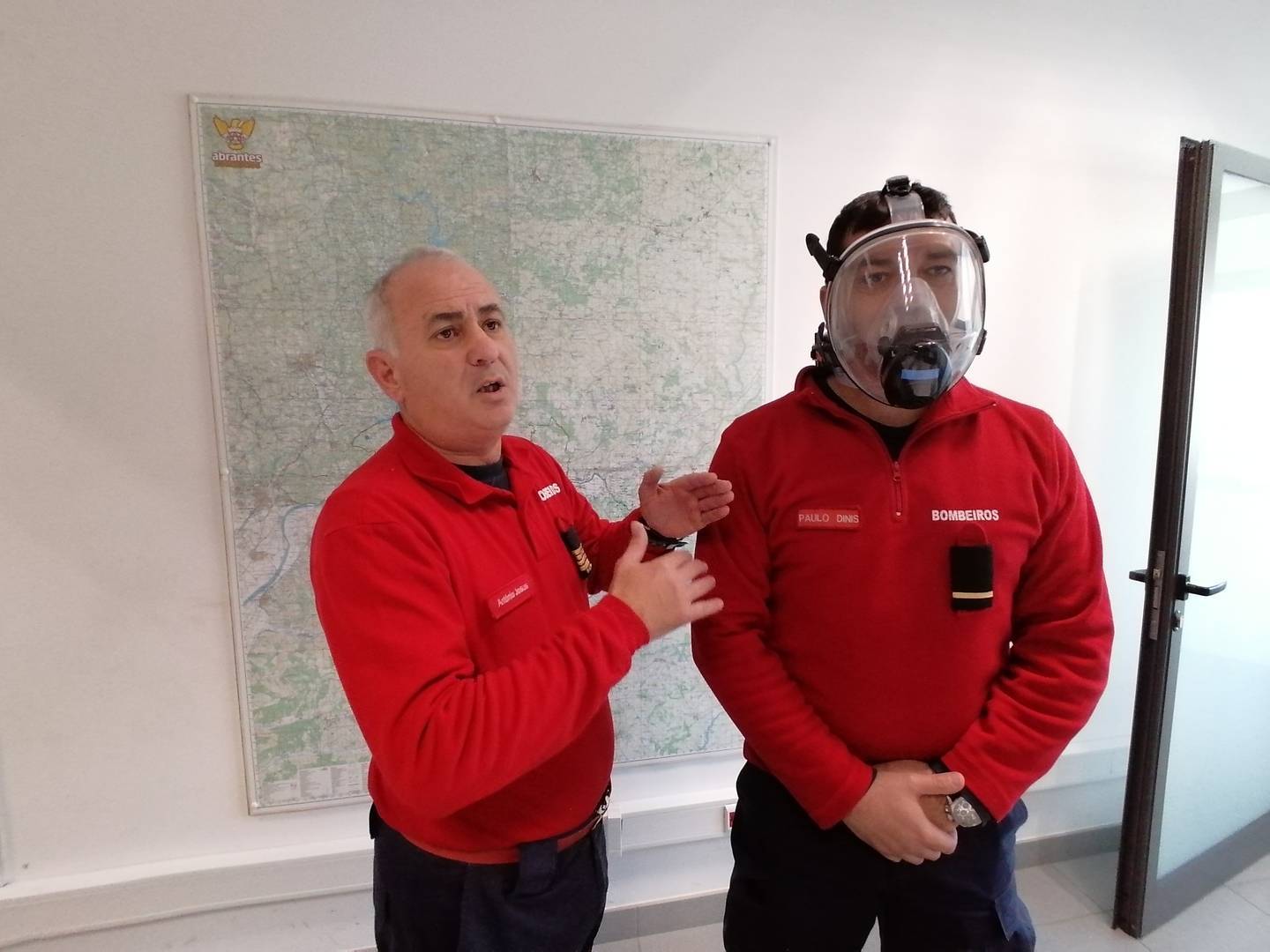 O bombeiro Paulo Dinis exemplificou o funcionamento das máscaras com ventilação, com as explicações do comandante António Manuel de Jesus