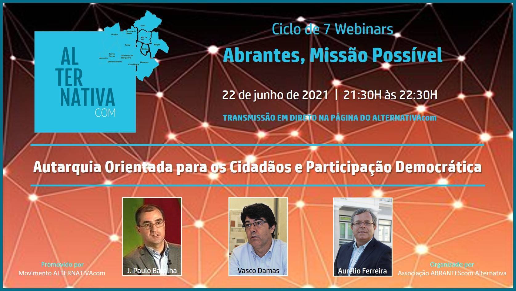 O movimento ALTERNATIVAcom termina o ciclo de webinares esta terça-feira, dia 22 de junho. O tema deste webinar vai ser "Autarquia Orientada para os Cidadãos e Participação Democrática"e os intervenientes serão Vasco Damas, Aurélio Ferreira e João Paulo Batalha.