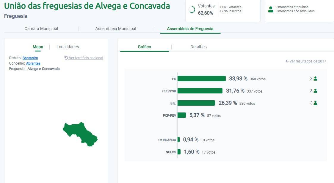 Em Alvega e Concavada José Felício foi reeleito embora com umas contas em que vai precisar de entendimentos ao longo do mandato. O PS conquistou 3 mandatos, o PSD de António Moutinho outros 3 e o BE de Eduardo Jorge os outros 3. Muita negociação é o que se espera que aconteça nesta freguesia.