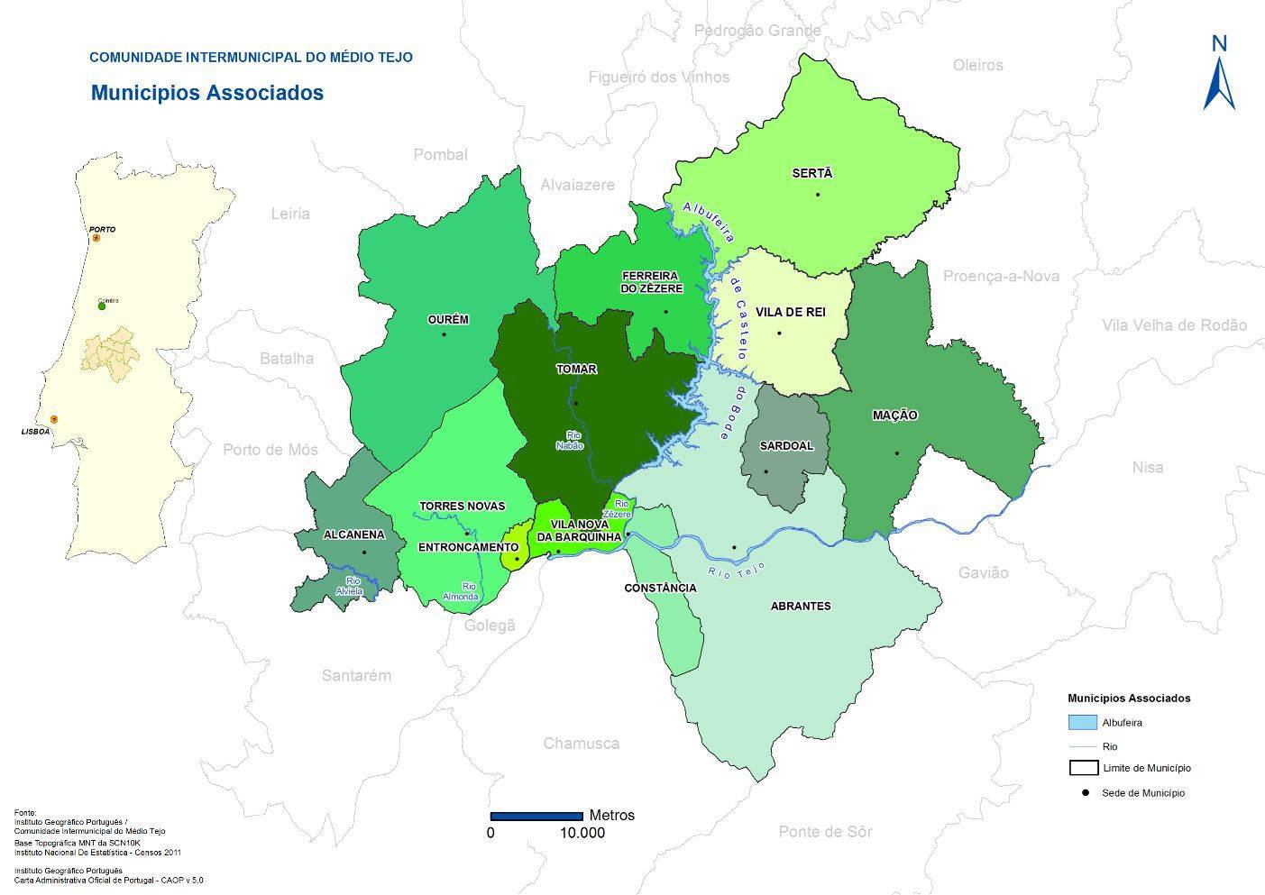 A CIM Médio Tejo integra os municípios de Abrantes, Alcanena, Constância, Entroncamento, Ferreira do Zêzere, Mação, Ourém, Sardoal, Sertã, Tomar, Torres Novas, Vila de Rei e Vila Nova da Barquinha.