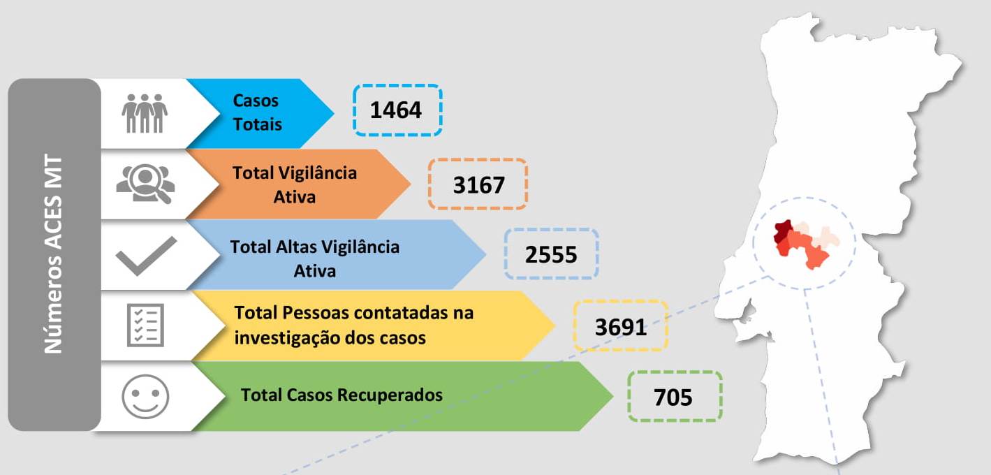 No Médio Tejo, com mais estes 139 casos positivos o total acumulado passou a ser 1464 casos positivos. De acordo com o relatório epidemiológico da Unidade de Saúde Pública do Agrupamento de Centros de Saúde do Médio Tejo os casos de hoje estão registados em Abrantes (34), Alcanena (1), Constância (3), Ourém (79), Tomar (16) e Torres Novas (6).