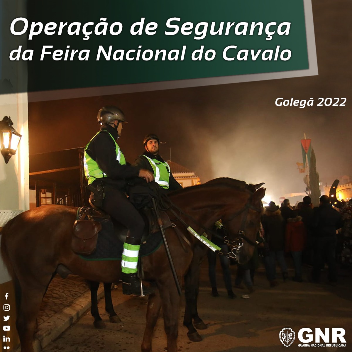 A Guarda Nacional Republicana (GNR), através do Comando Territorial de Santarém, está a realizar uma operação de segurança no âmbito da Feira Nacional do Cavalo, na Golegã e zona envolvente. Esta operação começou no dia 4, sexta-feira, e vai decorrer até domingo, dia 13 de novembro. Com esta ação a GNR pretende garantir a segurança e a tranquilidade pública de todos os visitantes, entidades e habitantes locais, bem como o controlo e fluidez rodoviária.