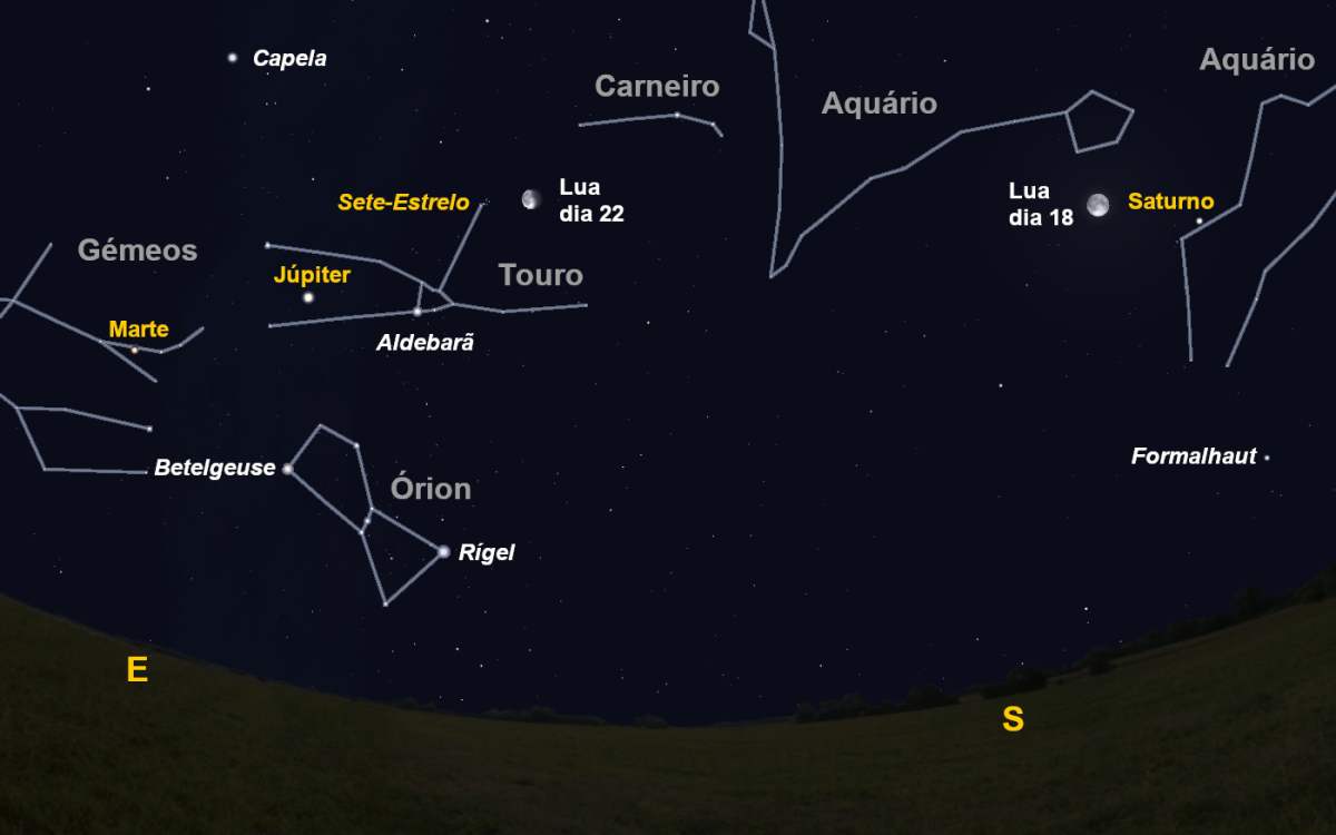 Figura 1: Céu a sudeste pelas três horas da madrugada de dia dezoito. Igualmente é visível a posição da Lua no dia vinte e dois.
