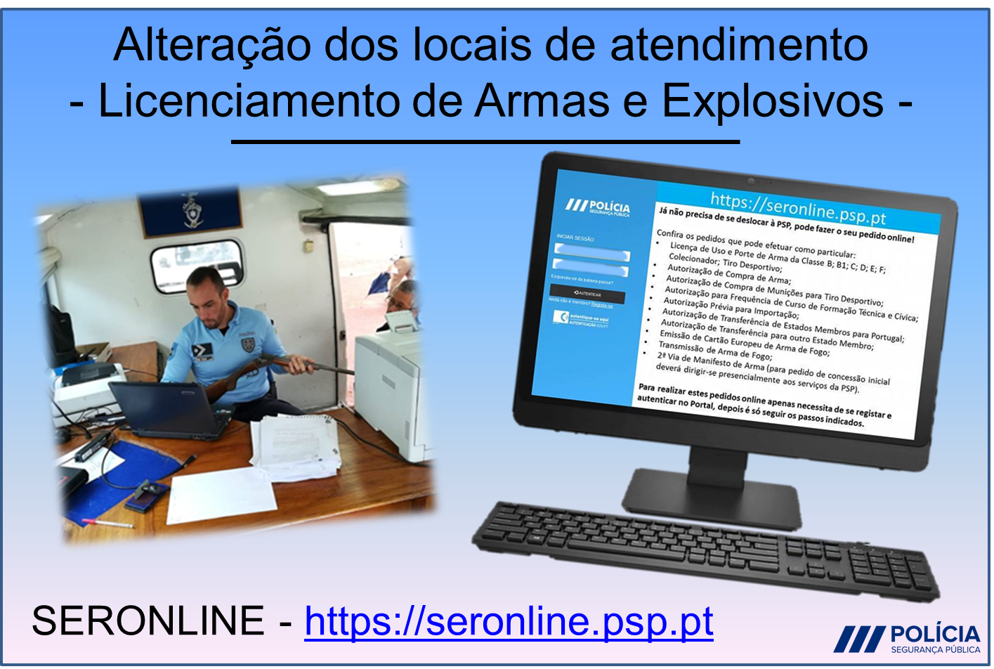 Relembra ainda que continua disponível o Portal de Serviços Online da Polícia de Segurança Pública (SERONLINE - https://seronline.psp.pt/psp/login.pdc) que, no âmbito do licenciamento de armas e explosivos, “promove uma interação simples, segura e desburocratizada, entre o cidadão e a PSP”. Neste Portal, após registo, os cidadãos acedem à sua área pessoal, onde podem consultar informação relativamente aos seus processos de licenciamento de armas e explosivos.
