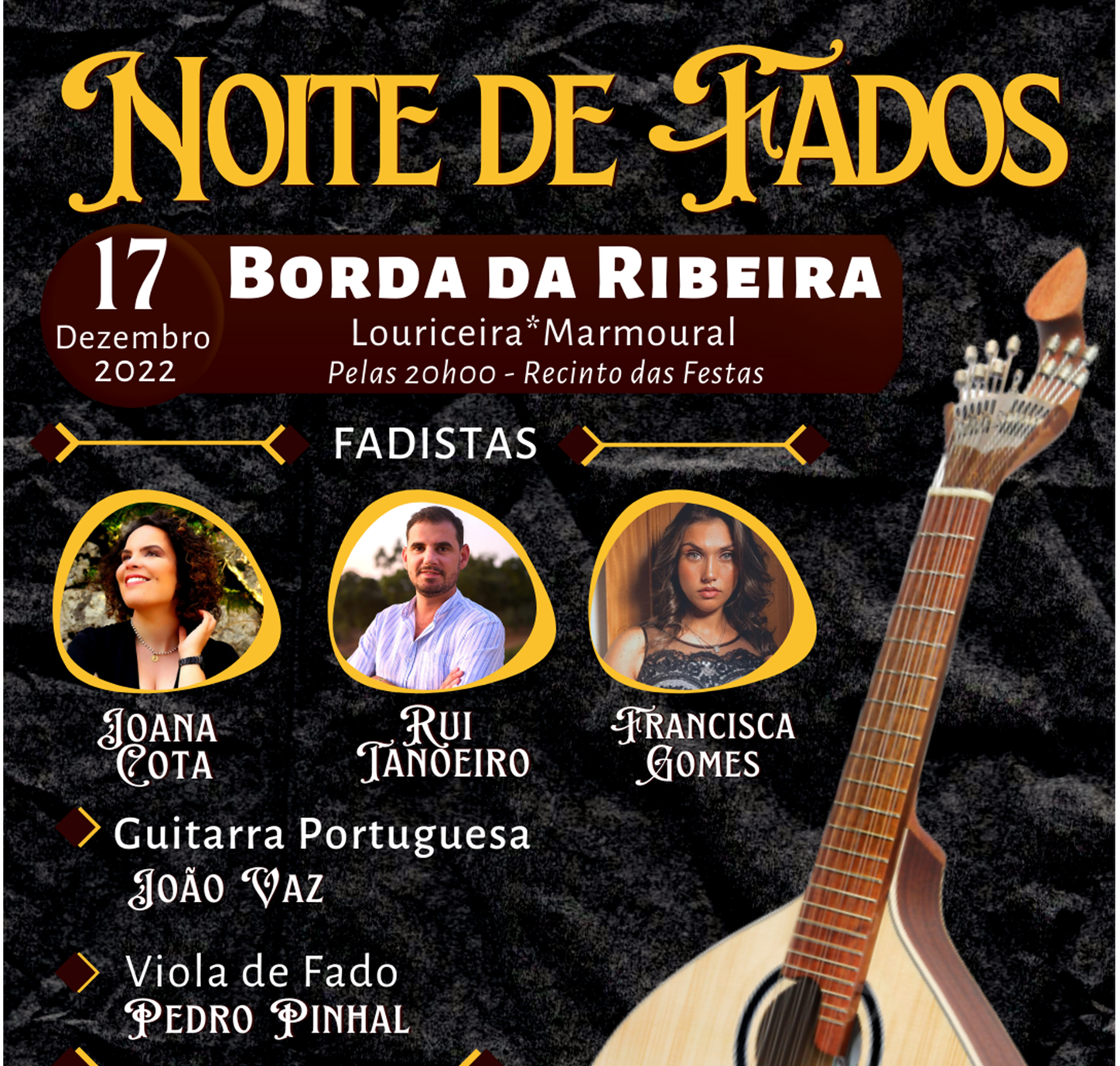 O evento vai contar com as presenças dos fadistas Joana Cota, Rui Janoeiro e Francisca Gomes, acompanhados por João Vaz, na guitarra portuguesa, e Pedro Pinhal na viola de fado.