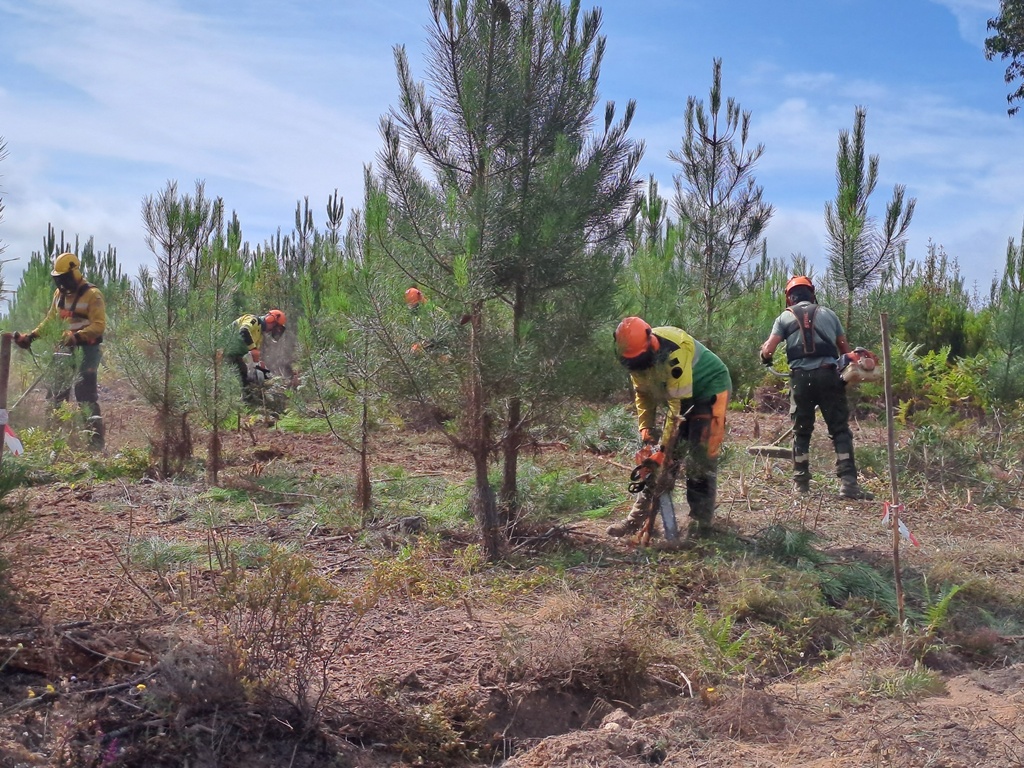Depois de serem criadas as faixas, entra uma equipa de sapadores, a limpar todo-o-terreno e a eliminar as árvores mais enfermas, deixando apenas as mais forte e com mais condições de virem a crescer para criar rendimento ao proprietário. Este trabalho tem um custo de 600 a 800 euros o custo de trabalho por hectare, mas neste caso com uma grande vantagem e poupança. O pinhal cresceu de forma natural, não houve despesa a semear os pinheiros ou na preparação das terras para as sementeiras. Luís Damas destacou ainda o facto de o pinheiro-bravo ter, ao contrário do eucalipto, um processo de regeneração natural. Precisa depois é de ser ordenado. Já os eucaliptos têm de voltar a ser plantados.