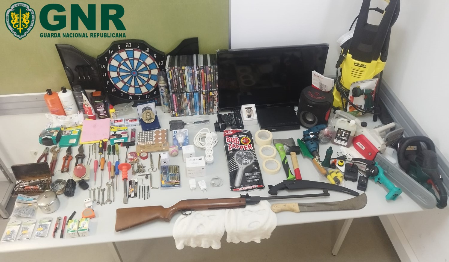 A Guarda indicou a lista dos bens recuperados, de onde se destacam: uma arma de pressão de ar; uma catana; uma televisão; um relógio; duas motosserras; uma máquina de lavar sob pressão; diversas ferramentas e material elétrico; e dois passa-montanhas.