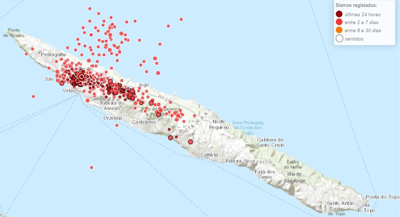 Segundo o secretário regional da Saúde, o padrão de sismicidade em São Jorge mantém-se inalterado, desde sábado, com sismos de baixa magnitude, mas o histórico sismosovulcânico da zona onde estão a ocorrer e os dados de satélite fizeram elevar o alerta do CIVISA, que já tinha subido para V3 no sábado.