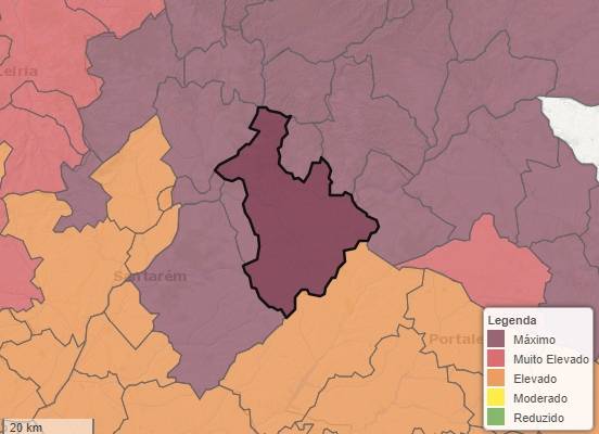 Neste nível de risco, o máximo, estão este sábado os concelhos de Abrantes, Constância, Chamusca, Ferreira do Zêzere, Mação, Sardoal, Tomar e Vila Nova da Barquinha (distrito de Santarém), Oleiros, Proença-a-Nova, Sertã e Vila Velha de Ródão (distrito de Castelo Branco) e Gavião e Nisa (distrito de Portalegre)