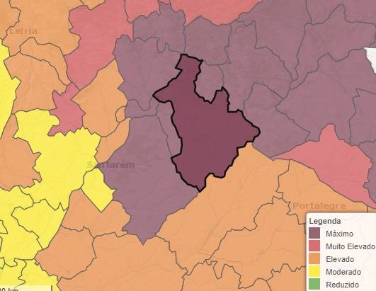 Em risco máximo estão concelhos dos distritos de Bragança, Guarda, Castelo Branco, Santarém, Portalegre e Faro. Neste lote encontram-se os concelhos de Abrantes, Constância, Ferreira do Zêzere, Mação, Tomar e Sardoal, no distrito de Santarém, Proença-a-Nova e Vila de Rei, no distrito de Castelo Branco, e ainda Gavião e Nisa, no distrito de Portalegrre.