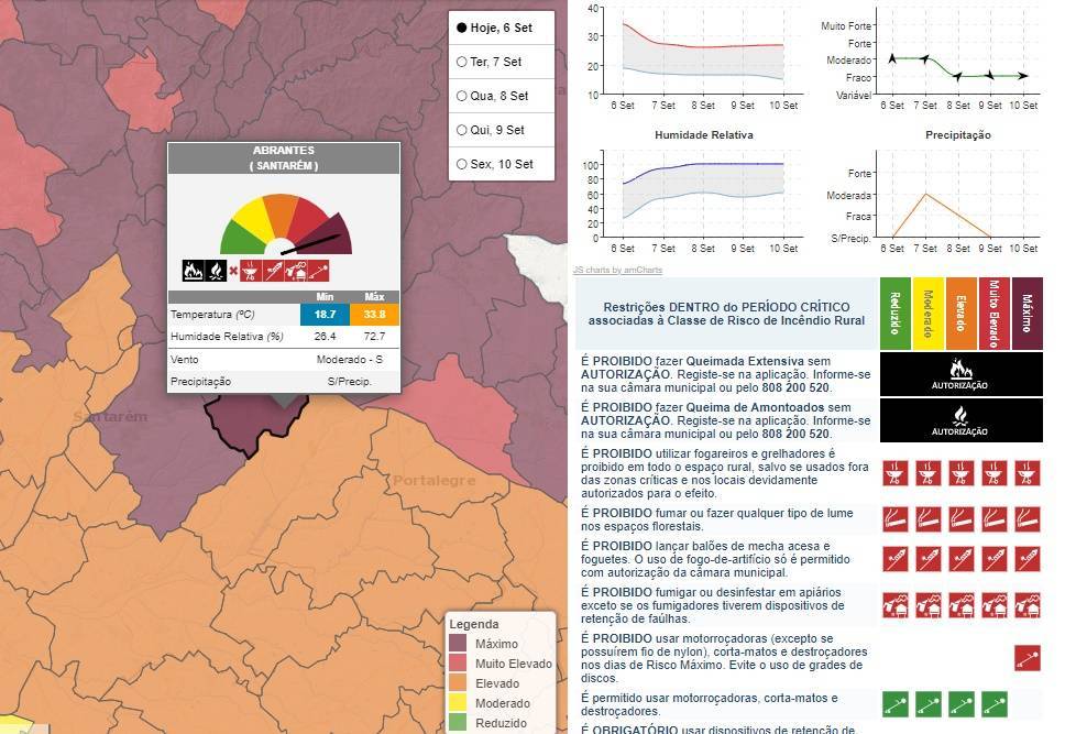 Em risco máximo estão mais de 100 concelhos dos distritos de Leiria, Santarém, Portalegre, Castelo Branco, Coimbra, Viseu, Guarda, Aveiro, Porto, Vila Real, Viana do Castelo, Braga, Bragança e Faro.