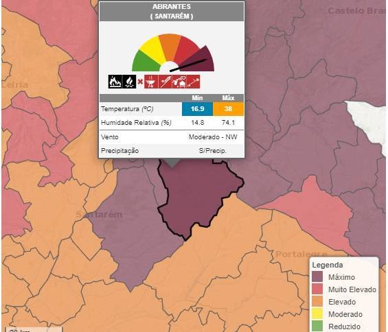 Em risco elevado está ainda quase toda a região do Alentejo e mais de quatro dezenas de municípios dos distritos de Lisboa, Santarém, Leiria, Coimbra, Aveiro, Porto, Braga e Viana do Castelo, Viseu e Setúbal.