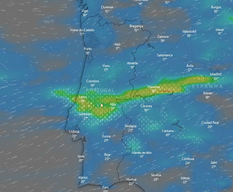 As previsões do IPMA apontam para hoje no continente céu muito nublado ou encoberto, com chuva, por vezes forte e persistente, em especial nas regiões Norte e Centro até final da manhã e para o final do dia, e possibilidade de ocorrência de trovoada.