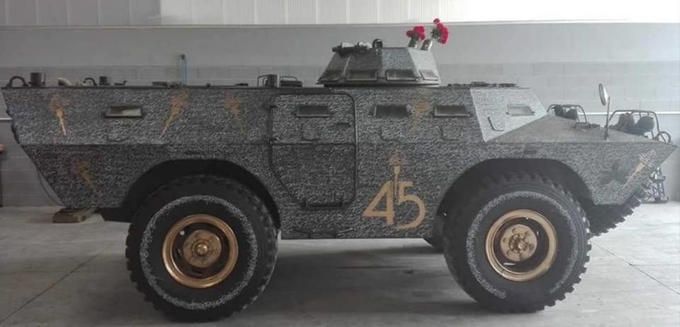 Naquela chaimite que fez parte do contingente militar português, destacado na Guerra da Bósnia [entre 1992 e 1995], o ex-assessor do PS desenhou e pintou cravos dourados, colocou cravos vermelhos no lugar onde estava a metralhadora e pintou, a caneta branca, uma composição gráfica, exercitando o “lado gestual da escrita”.