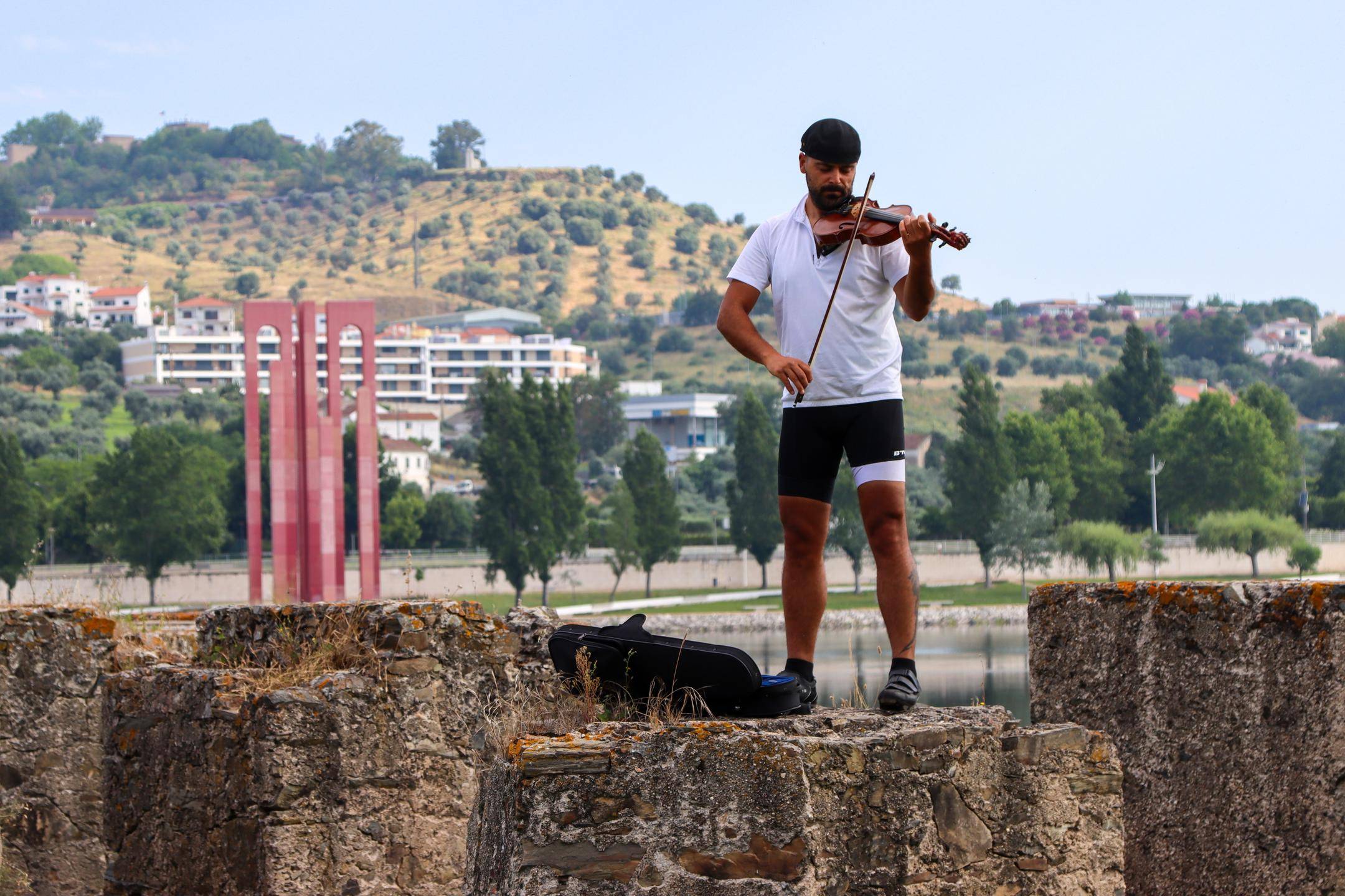 Planeou fazer a Nacional 2 em bicicleta mas, afinal, acaba por percorrer o país. Sempre com o violino às costas e a tocar nos sítios mais improváveis. Esta manhã parou em Abrantes, com destino a Évora.
