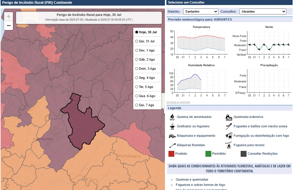 Este perigo, determinado pelo IPMA, tem cinco níveis, que vão de reduzido a máximo. Os cálculos são obtidos a partir da temperatura do ar, humidade relativa, velocidade do vento e quantidade de precipitação nas últimas 24 horas.