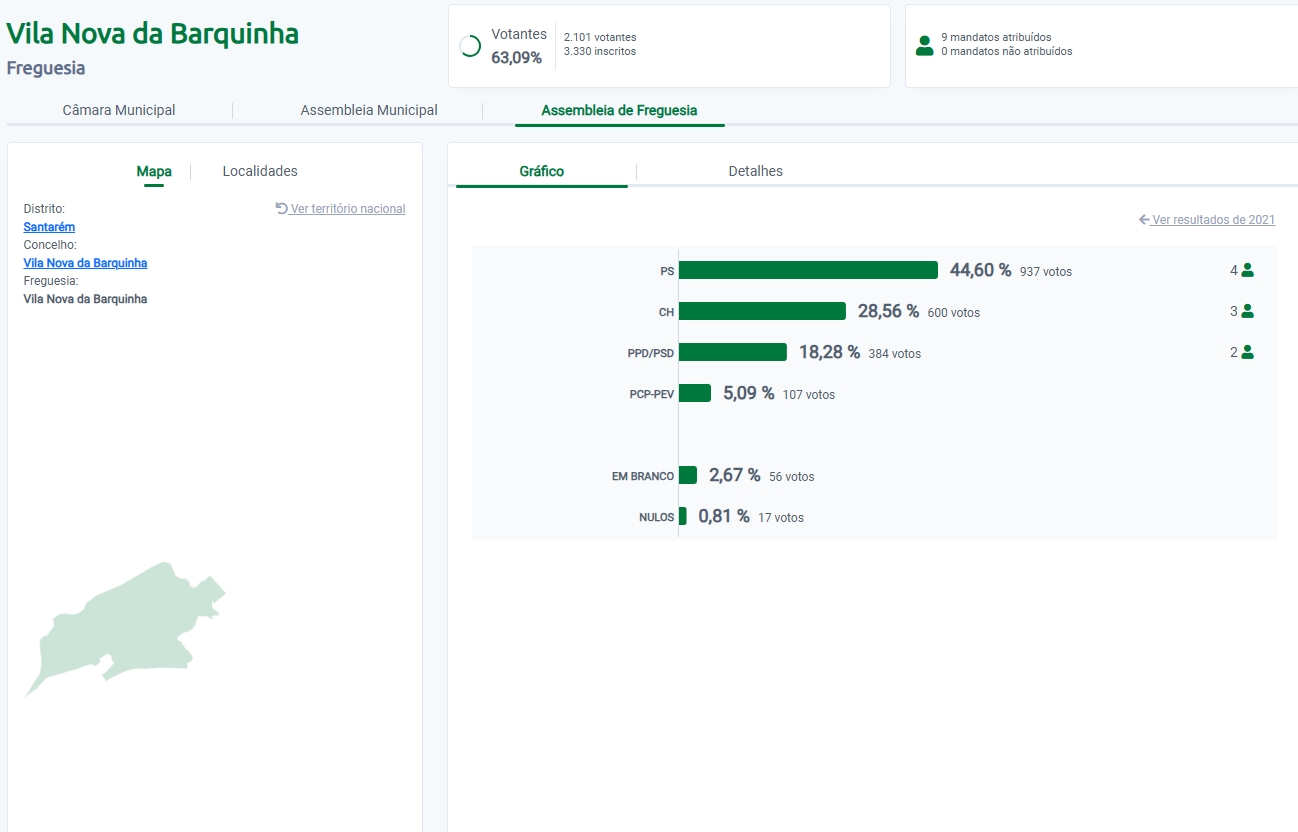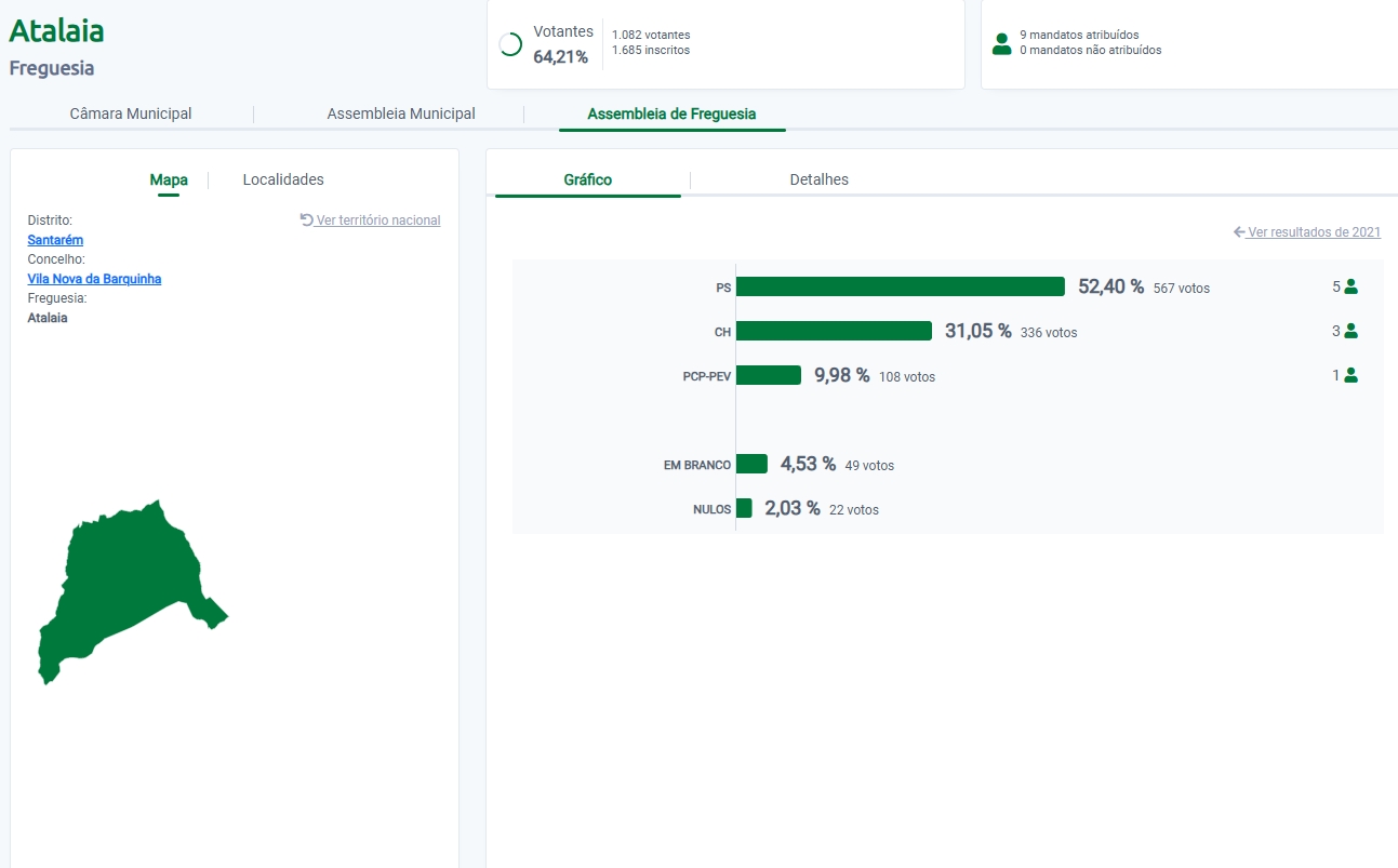 Nos resultados de domingo o PS voltou a ganhar com 42, 36%, mas desta vez em maioria relativa, apesar de ter tido mais votos expressos do que em 2021. O CHEGA chegou aos 31,32%, e uma subida exponencial e o PSD, com 16,16% também subiu em votos expressos. Só a CDU registou uma quebra em relação a 2021.