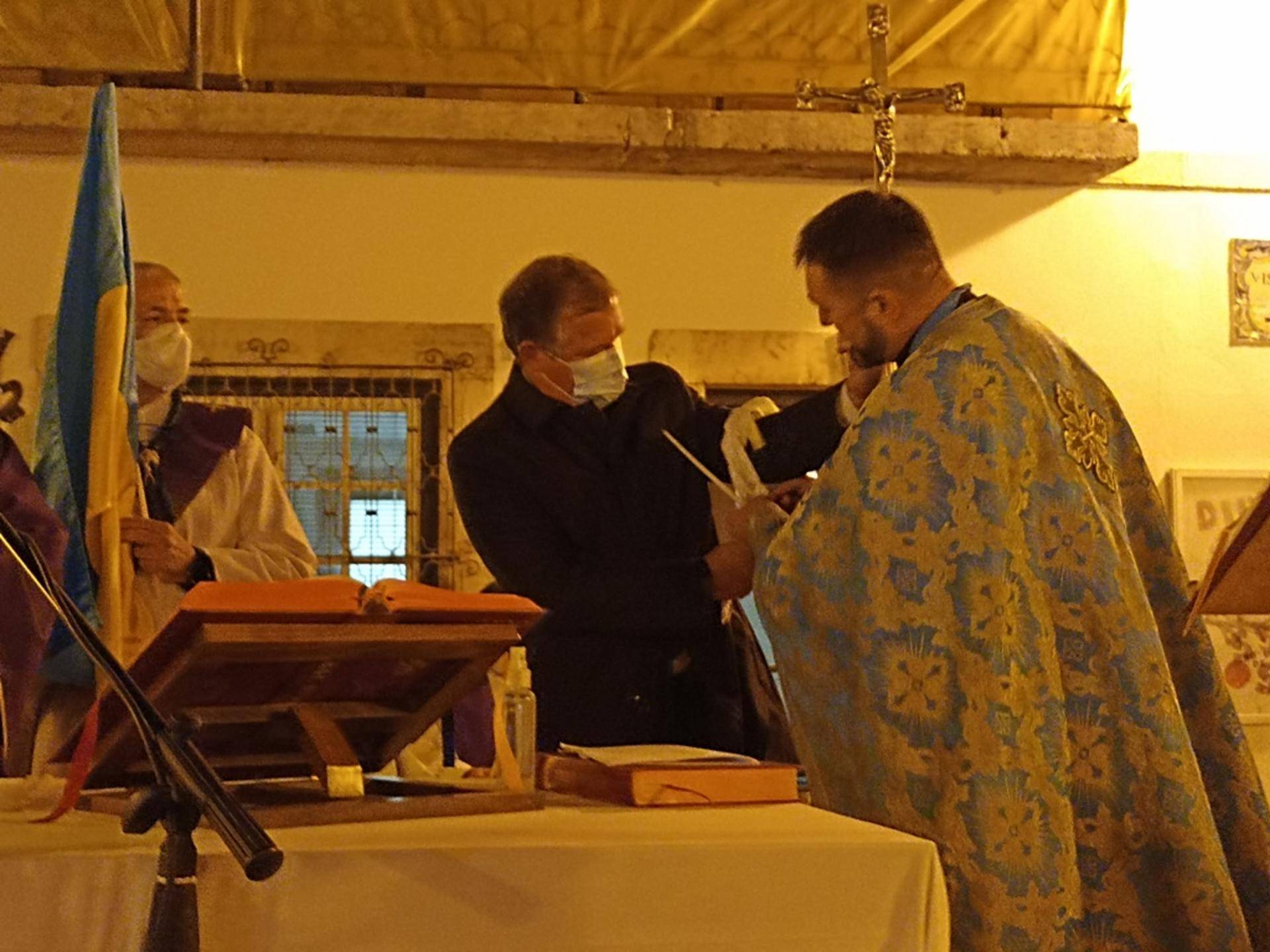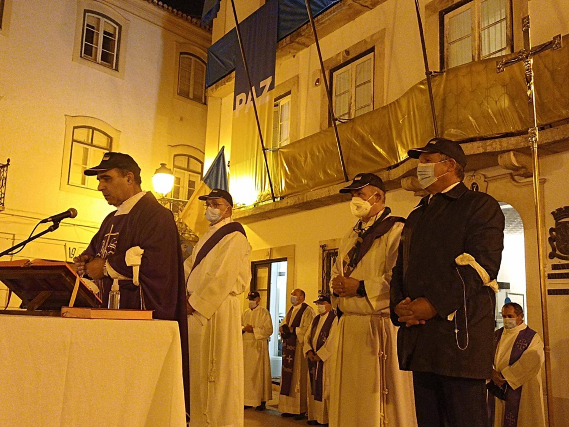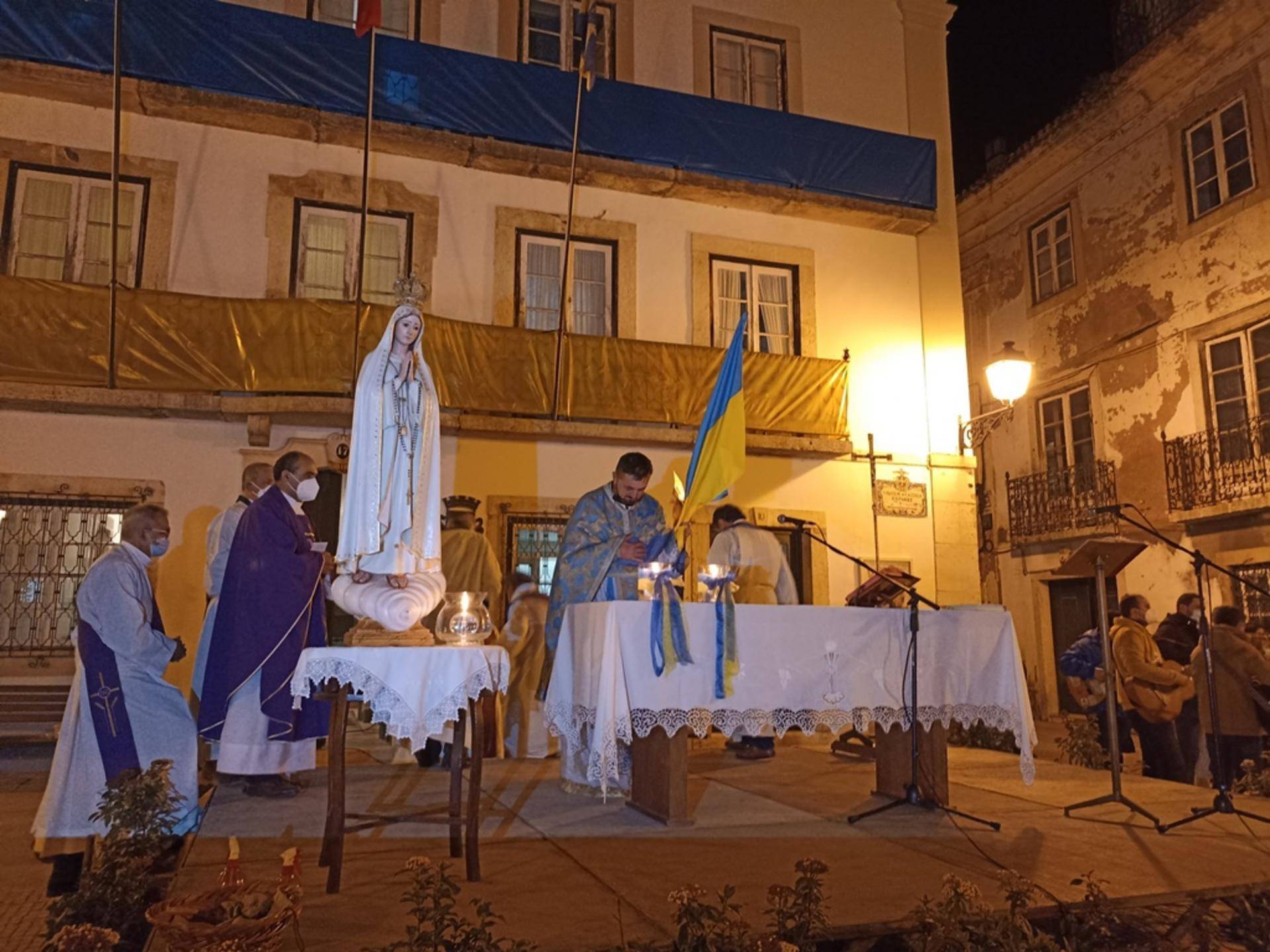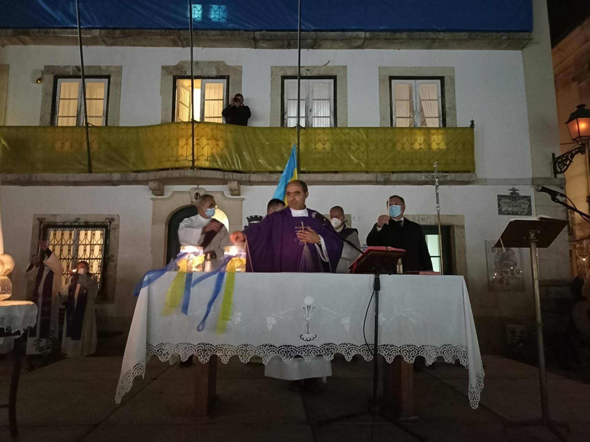 Os párocos com as vestes do tempo que vivemos, em termos católicos, a Quaresma. O padre Ivan com as suas vestes da igreja Ortodoxa, mas de bandeira da Ucrânia na mão acompanhou a celebração num altar com a Imagem de Nossa Senhora presente e com uma praça composta por abrantinos e por ucranianos que vivem por estas bandas e que quiseram estar presentes.