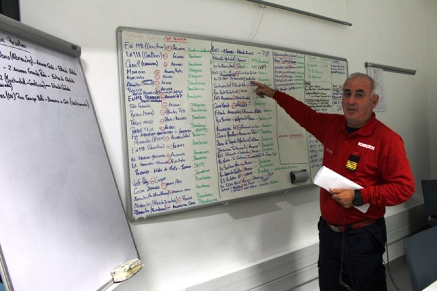 António Manuel mostra ainda os mapas do concelho onde são assinaladas todas as ocorrências [com recurso a uns marcadores, umas bolas vermelhas ou azuis] para se ter uma noção mais clara da situação do concelho.
