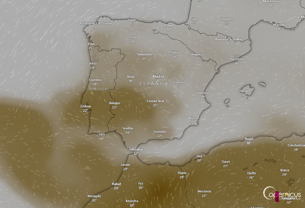 Para esta terça-feira está ainda prevista a chegada de uma vaga de poeiras oriundas do Norte de África arrastadas pelos ventos. O fenómeno atmosférico vai notar-se no céu que ficará mais alaranjado e vai fazer-se sentir sobretudo na quinta e na sexta-feira.