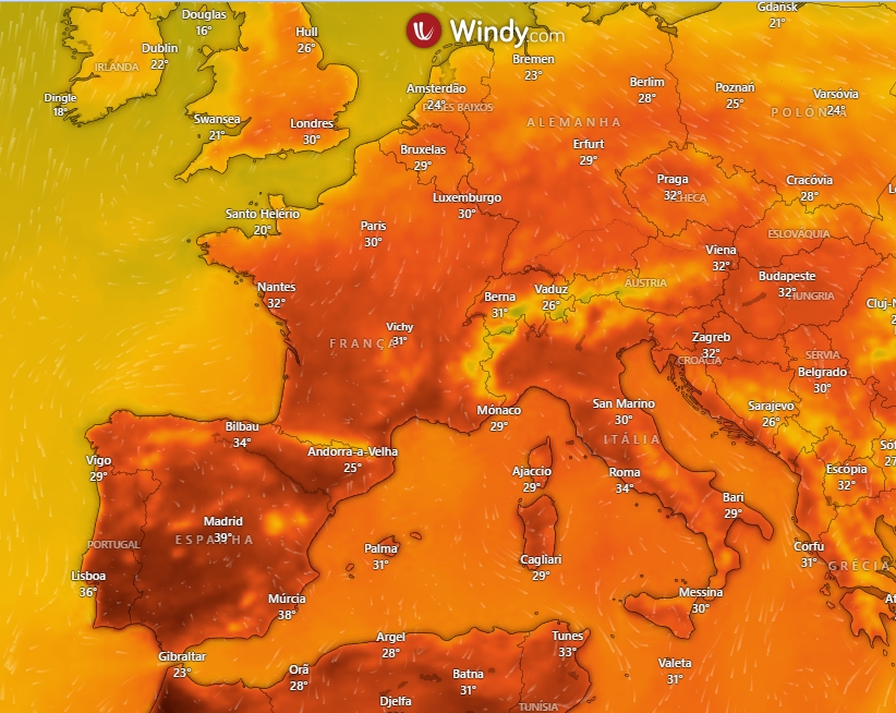 A França também não foi poupada pela vaga de calor que começou na sexta-feira. Dos 95 departamentos do país, 84 foram colocados em alerta laranja para segunda-feira, em comparação com 73 no domingo, e são esperadas máximas de 40°C no sul do Mediterrâneo.